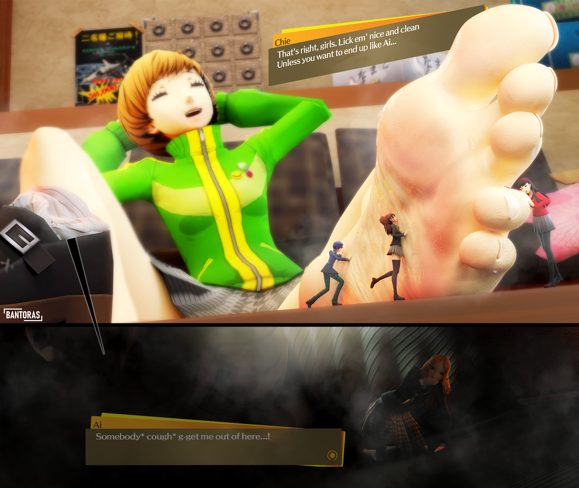 Ai was the first to refuse, so Chie dropped her in her shoe and shoved a sock in the top. Ai gasped for fresh air within the stench and begged to be set free. Chie then asked if anyone else had any objections, and they reluctantly agreed to help. Naoto massaged her tired sole while Rise and Yukiko lapped up the drops of sweat covering her foot. Very satisfied, Chie kicked back and relaxed as her new servants did their job.
