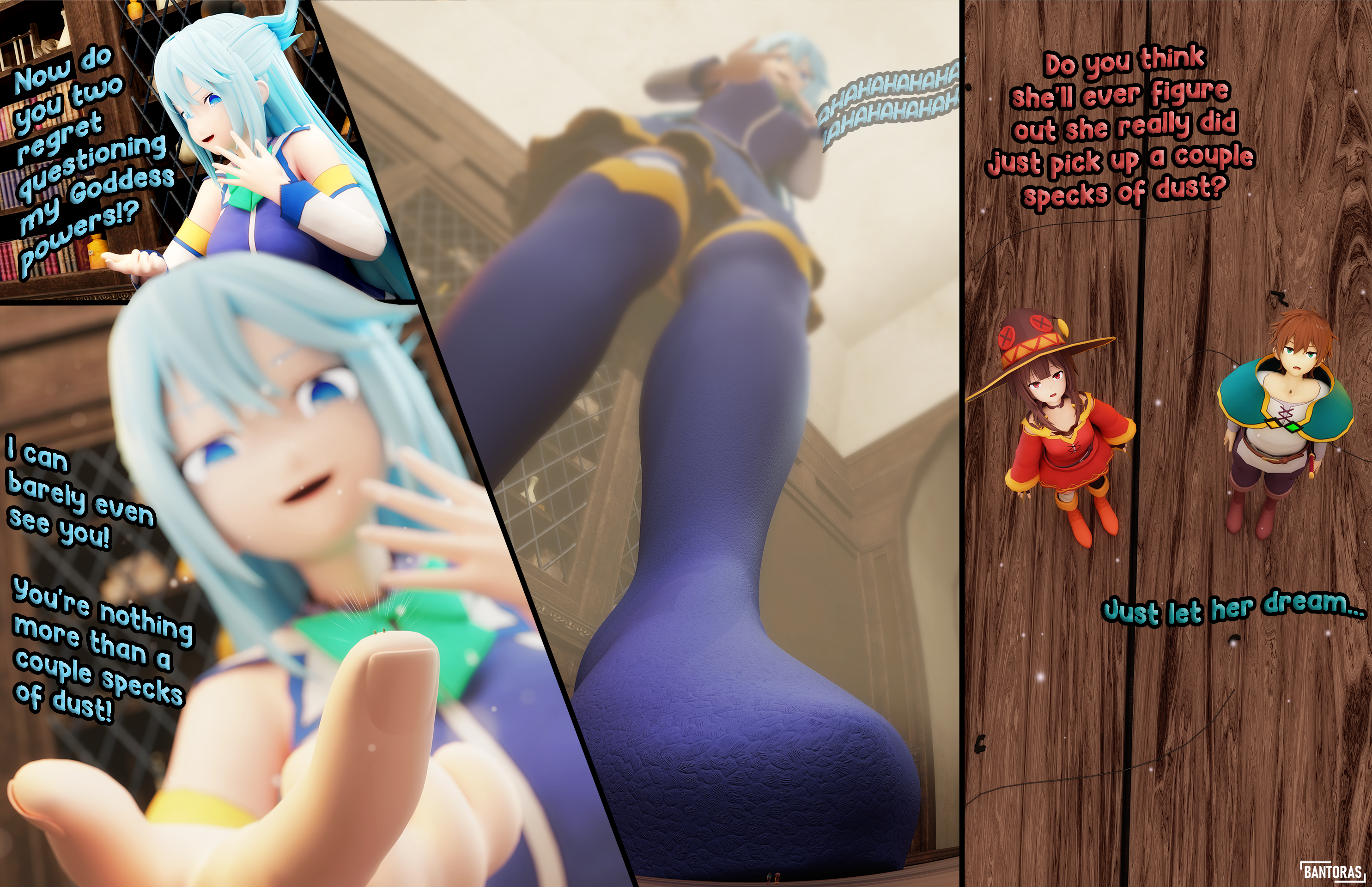 Tired of Kazuma and Megumi’s antics, Aqua decides to use her Goddess powers to it’s fullest extent, shrinking the two of them down to mere specks.