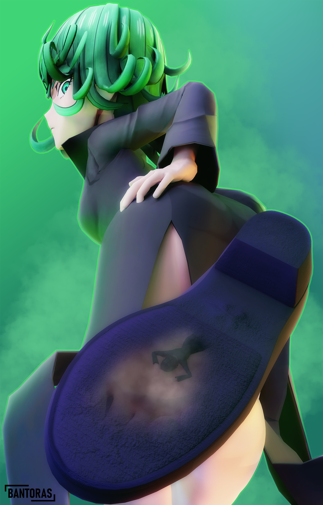 Tatsumaki needs to teach her shrunken sister Fubuki a lesson. She drops the tiny girl in her shoe, after which she taunts her and inserts her foot to seal Fubuki’s fate.